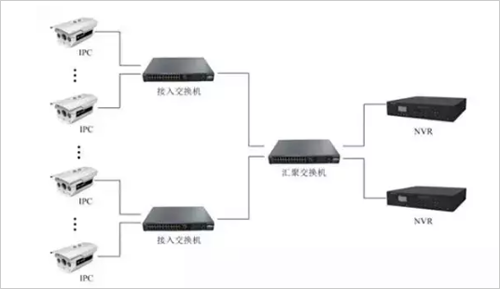 針對(duì)于50個(gè)點(diǎn)以上的中大型工程,需要采用三層網(wǎng)絡(luò)架構(gòu):接入層、匯聚層、核心層。